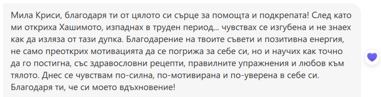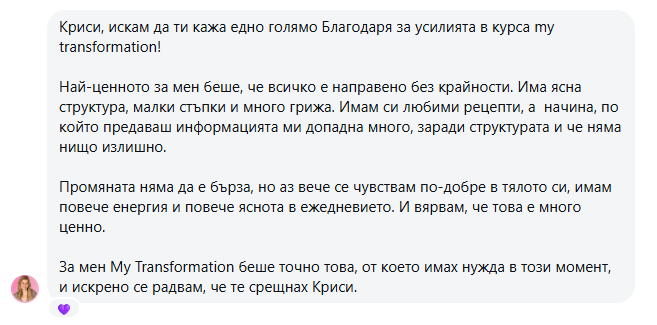 "Беше ми трудно да стартирам трансформацията на моето тяло, но се запознах с Криси и нейната програма. Благодарение на нея аз разбрах, че мога да постигна много и даже ще ми е приятно!